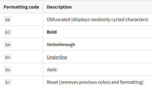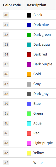 高级颜色本页总览颜色 可以在所有的文本中使用颜色和颜色代码 RGB颜色 注意自定义颜色仅适用于 Spigot 1.16 或更高版本,并且只有客户端在 Minecraft 1.16 或更高版本上才能正确显示 使用十六进制颜色格式显示自定义颜色:。HEX颜色必须恰好由6个十六进制字符组成(0123456789abdedf,不区分大小写)。 HEX颜色选择器可以帮助找到正确的颜色代码,例如这个 例子: /hd create example FF87D1Pink 标准色表 标准格式代码